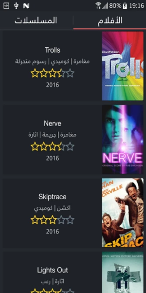 - قسم الأفلام: يهتم التطبيق بجلب أفضل الأفلام سواء عربية أو أجنبية، ويقوم بوضعها فى هذا القسم، ويتم الاهتمام بتوفير ترجمة دقيقة للمحتوى الذي يتم عرضه بلغة أجنبية إلى اللغة العربية، ويهتم بعرض العديد من الأنواع بالداخل، منها أفلام دراما وكوميديا وتراجيديا وأكشن ورومانسية.